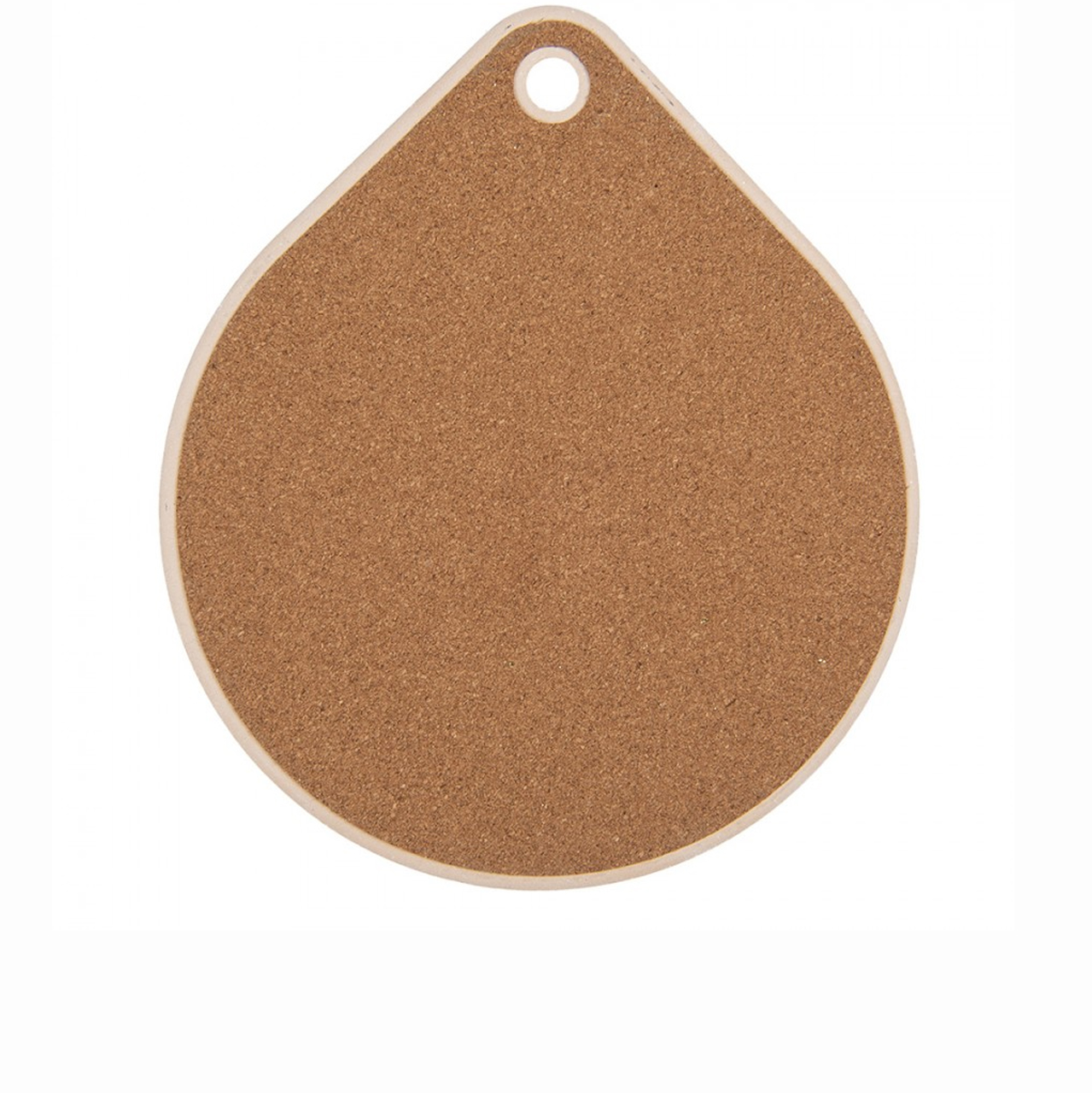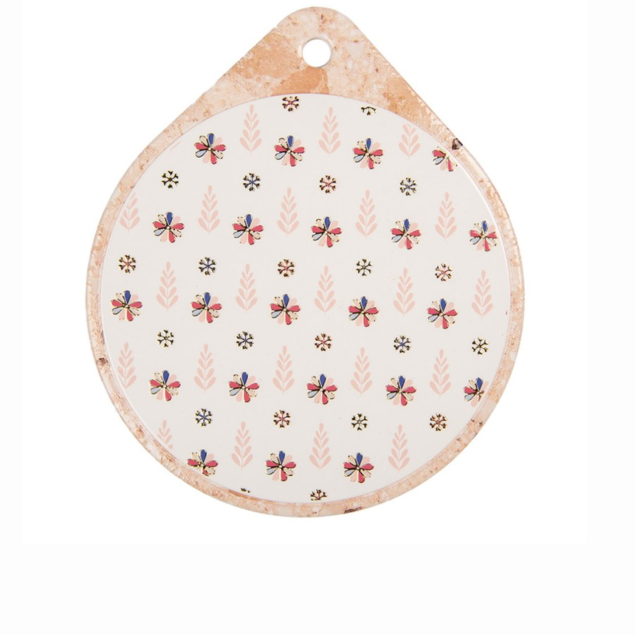 A hot plate stand with a colorful floral design. It is made of ceramic and has a cork layer on the bottom, ensuring that it remains safe and stable on the table or counter.