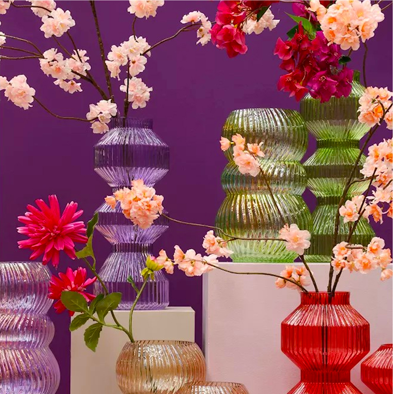 Green glass vase with a unique, embossed shape. Ideal for flowers or as a decorative element with character.