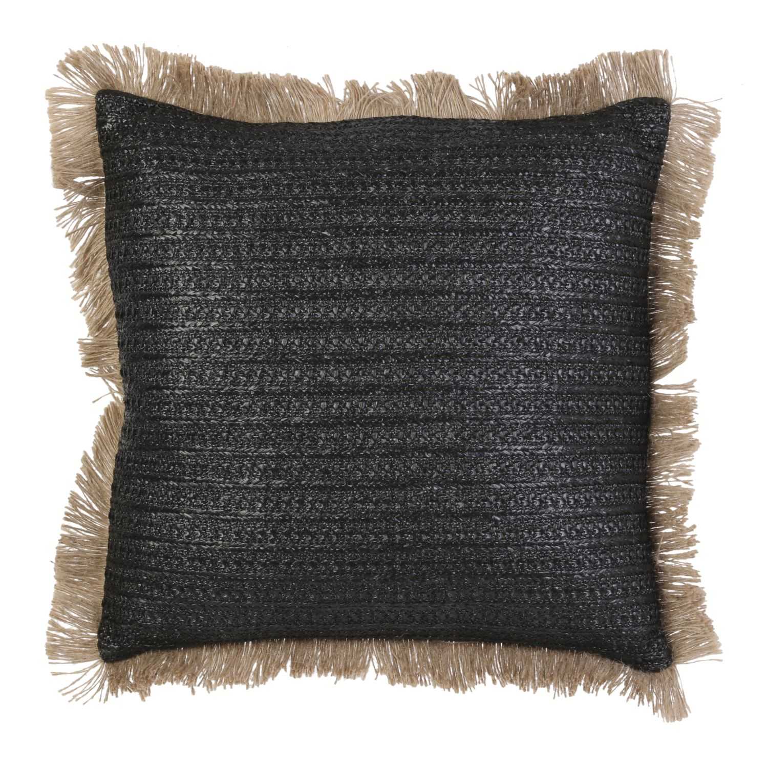 The decorative cushion is made of textline, in black with beige fringes, and measures 40×40 centimeters. It adds an elegant and modern touch to any space, combining comfort and style.