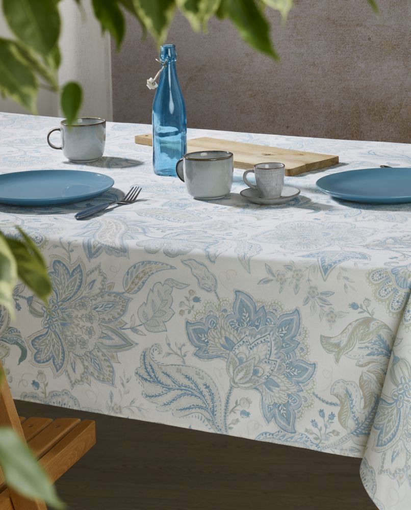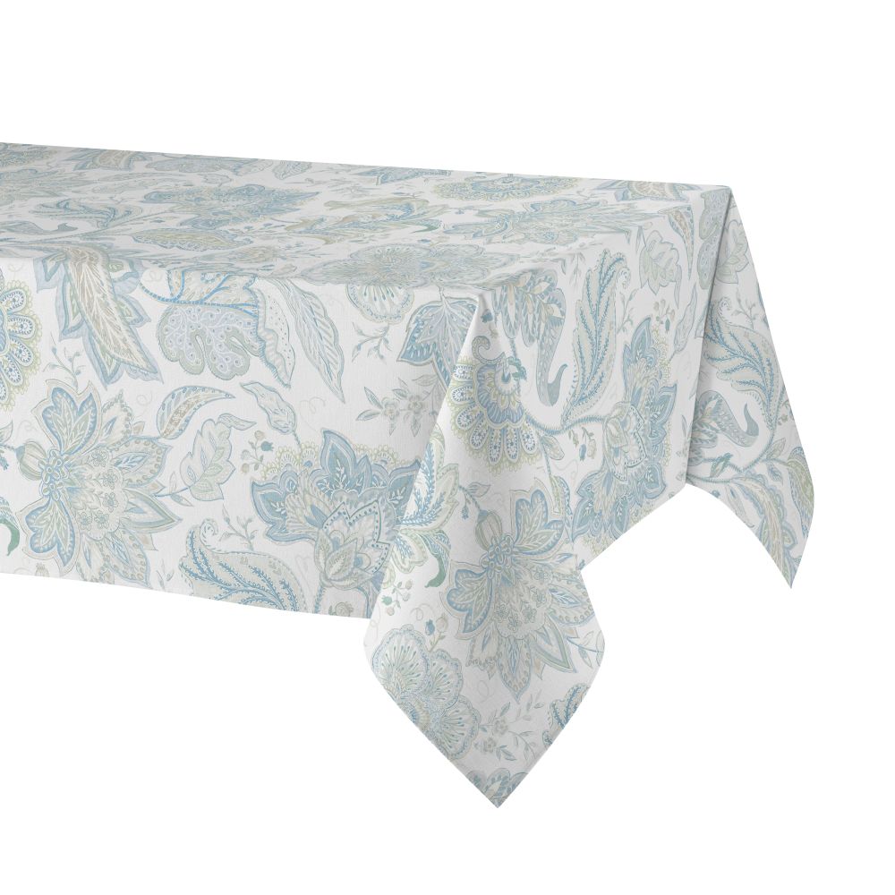 Elevate your table setting for any occasion with the stain-resistant Fiorella tablecloth. Crafted from a blend of 50% cotton and 50% polyester, it combines the softness of cotton with the durability of polyester. Featuring three layers of protection and a refined hemmed finish, this tablecloth offers both elegance and practicality. Its crisp white color with a turquoise design adds a fresh touch of sophistication to every meal, making it the perfect choice for those who value style and functionality.