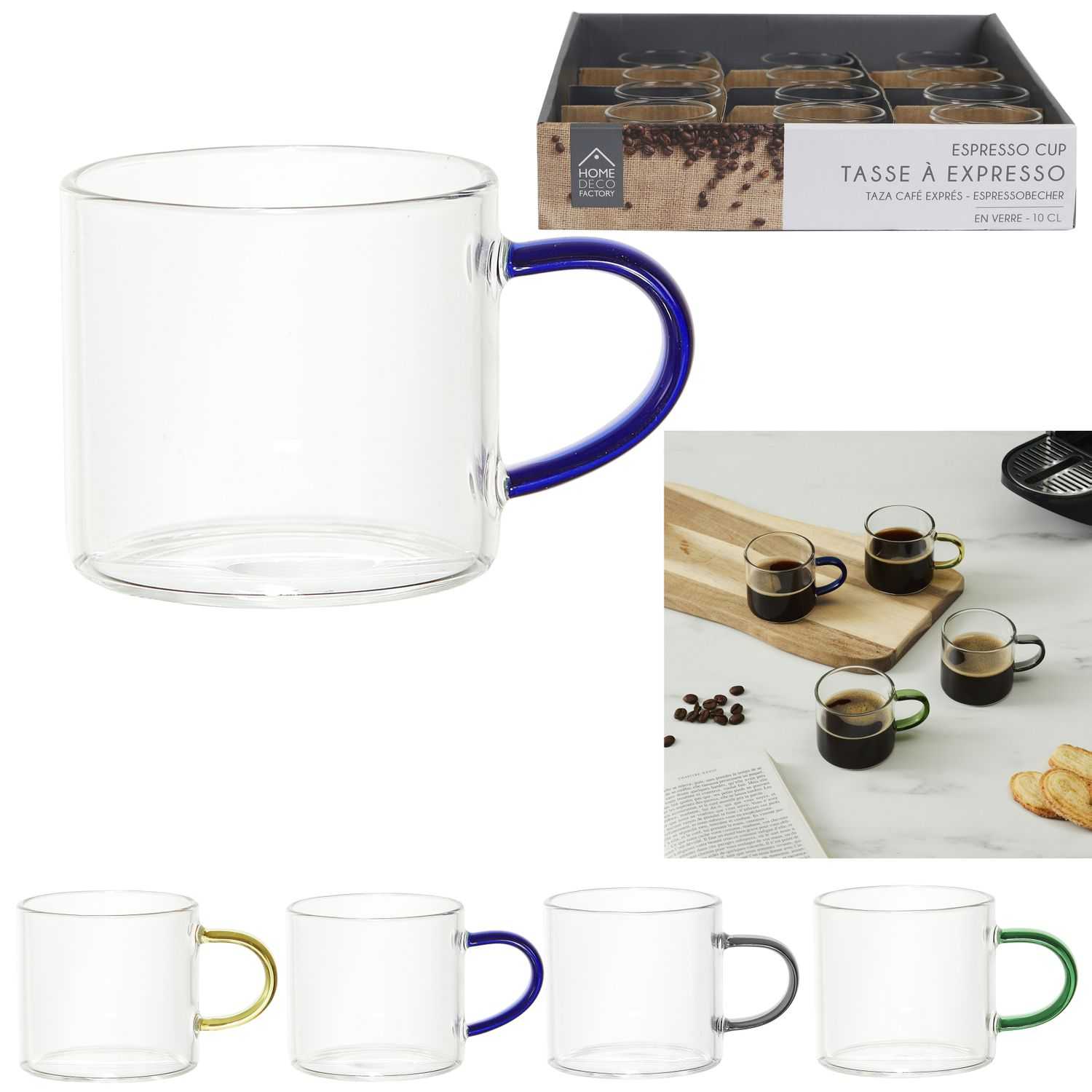 The espresso cup is clear glass with a 15cl capacity and features a colored handle. It comes in four colors: green, black, blue, and yellow, providing a stylish and vibrant option for enjoying your espresso.