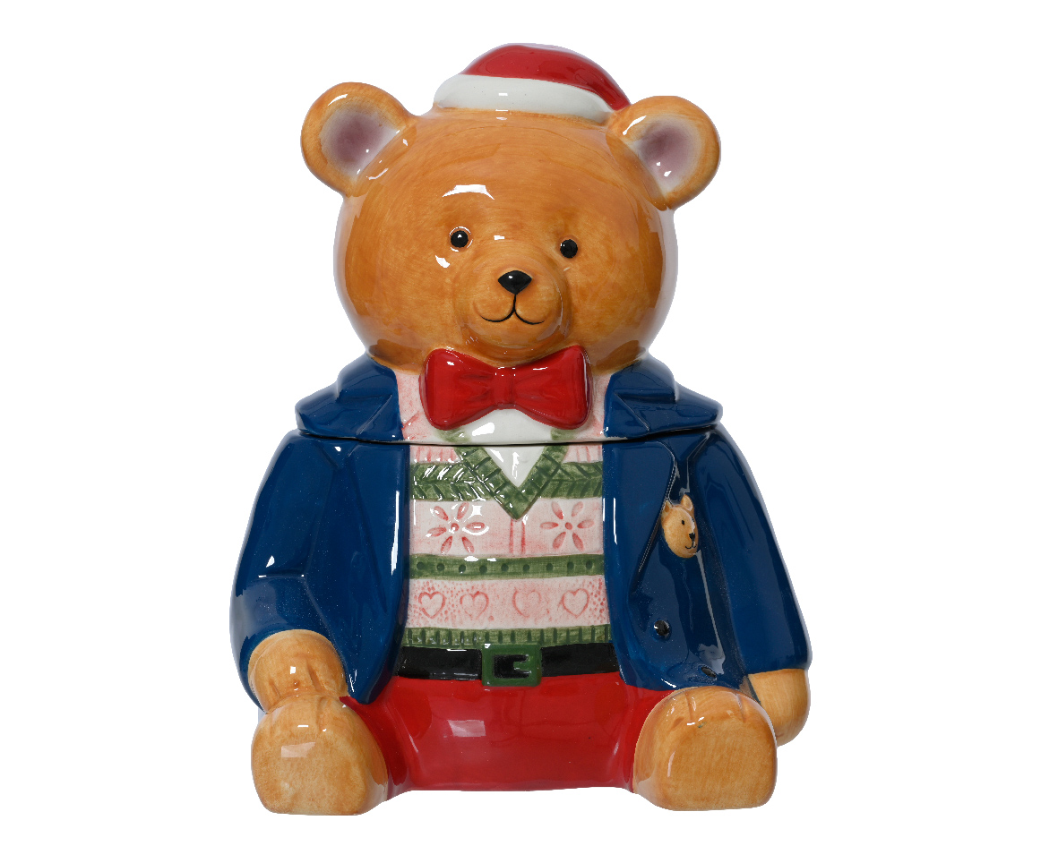Boy bear-shaped cookie jar made of dolomite, measuring 16x15x20cm. This adorable cookie jar is perfect for storing your favorite cookies or treats, adding a playful touch to your kitchen. With its charming boy bear design, it will delight both children and adults alike. Its also a wonderful gift choice for little friends or family. Create a warm and welcoming atmosphere in your home with this whimsical cookie jar!