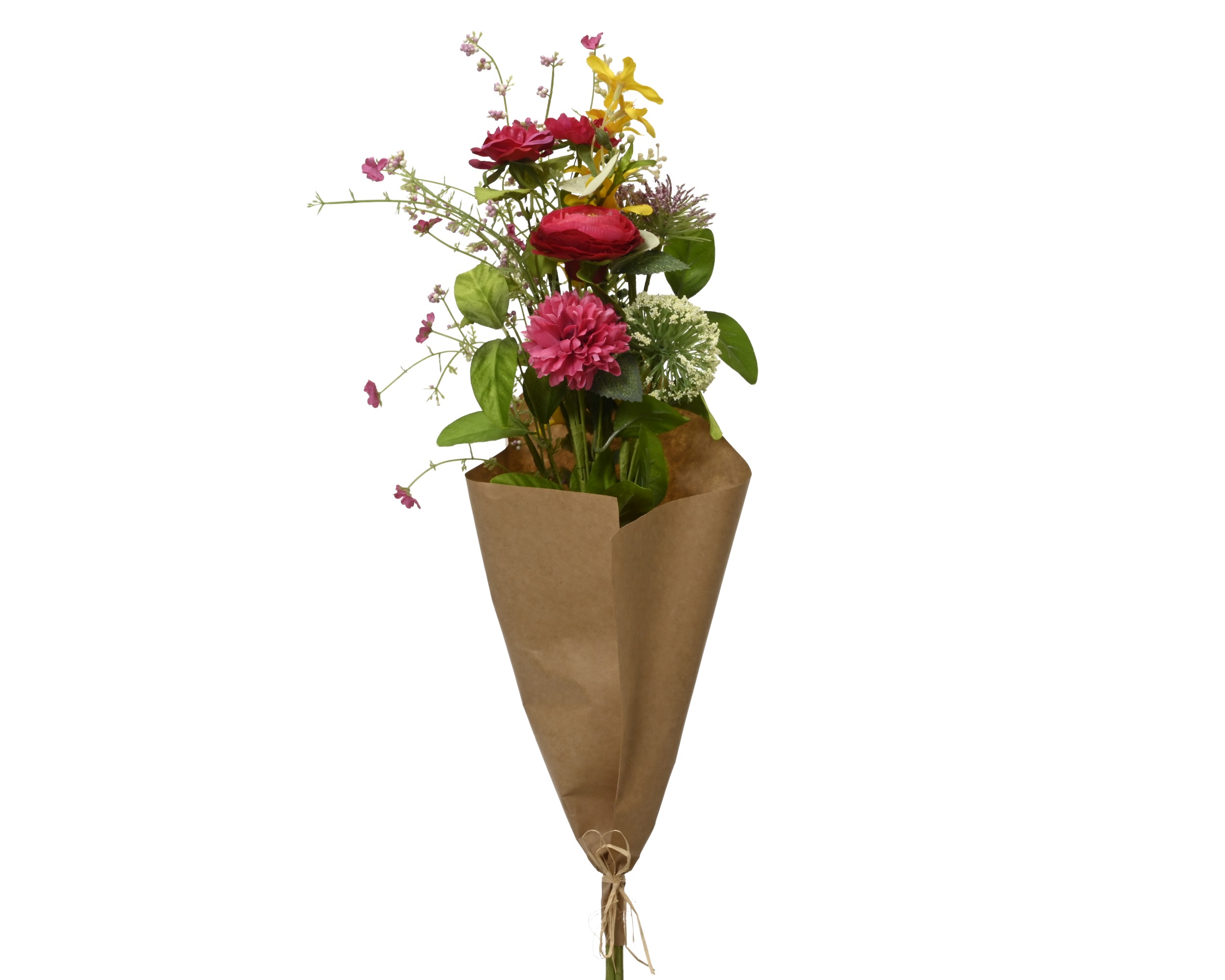 Ένα πολύχρωμο τεχνητό μπουκέτο με παιώνιες, αγριολούλουδα και μαργαρίτες που αποδίδει την φυσική ατμόσφαιρα του κήπου. Το συνολικό ύψος του φτάνει τα 70 εκατοστά, με διάμετρο 20 εκ. και πλάτος 13 εκ.