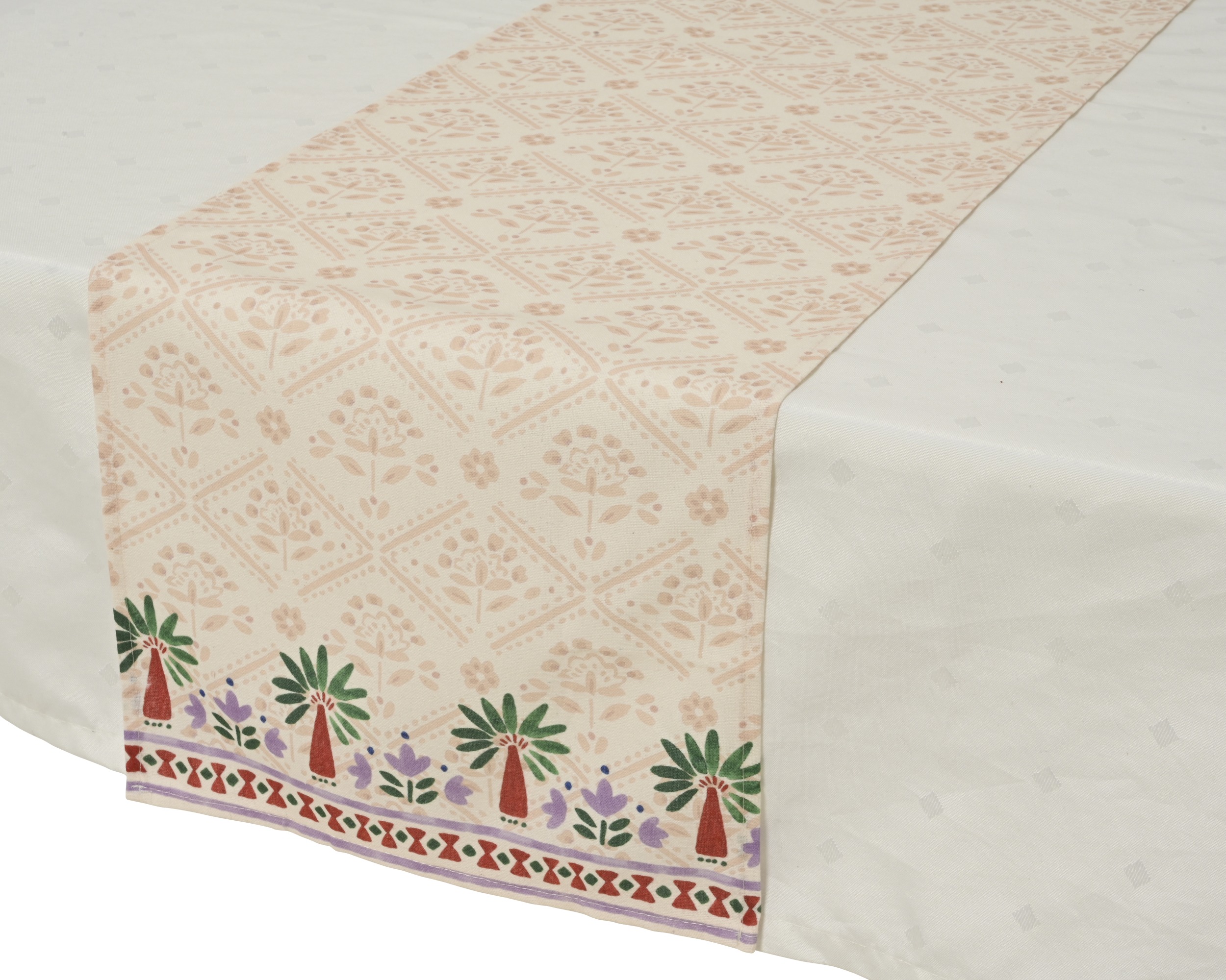 Το τραπεζομάντηλο runner της εταιρείας Decoris αποτελεί την ιδανική επιλογή για να προσδώσει ζωντάνια στο χώρο του τραπεζιού σας. Κατασκευασμένο από μαλακό ύφασμα πολυεστέρα-βαμβακιού, διαθέτει γεωμετρικό σχεδιασμό με ψηφιακή εκτύπωση που απεικονίζει φοίνικες και λουλούδια σε ζωηρά χρώματα.