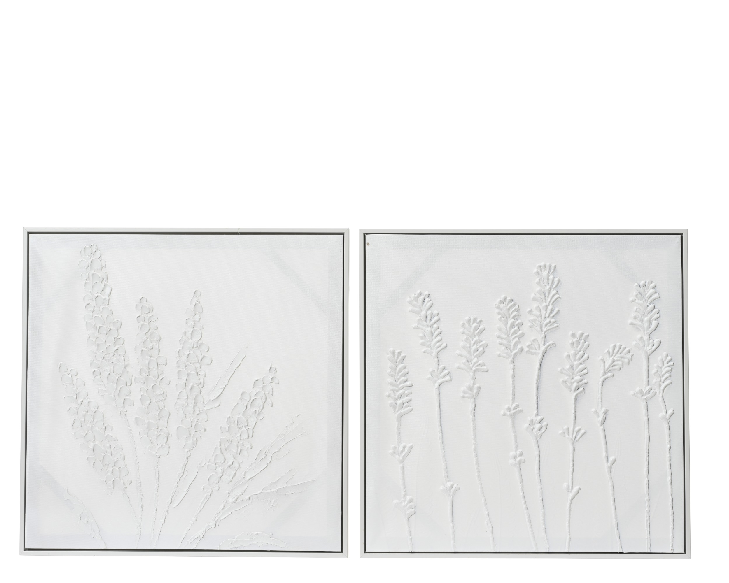 Ένα σετ καμβάδων ζωγραφικής που θα δώσει χαρακτήρα στον χώρο σας. Περιλαμβάνει δύο κομμάτια σε απαλό λευκό χρώμα με διακριτική, μερική χειροποίητη floral διακόσμηση που προσθέτει βάθος και υφή στον τοίχο.