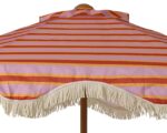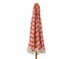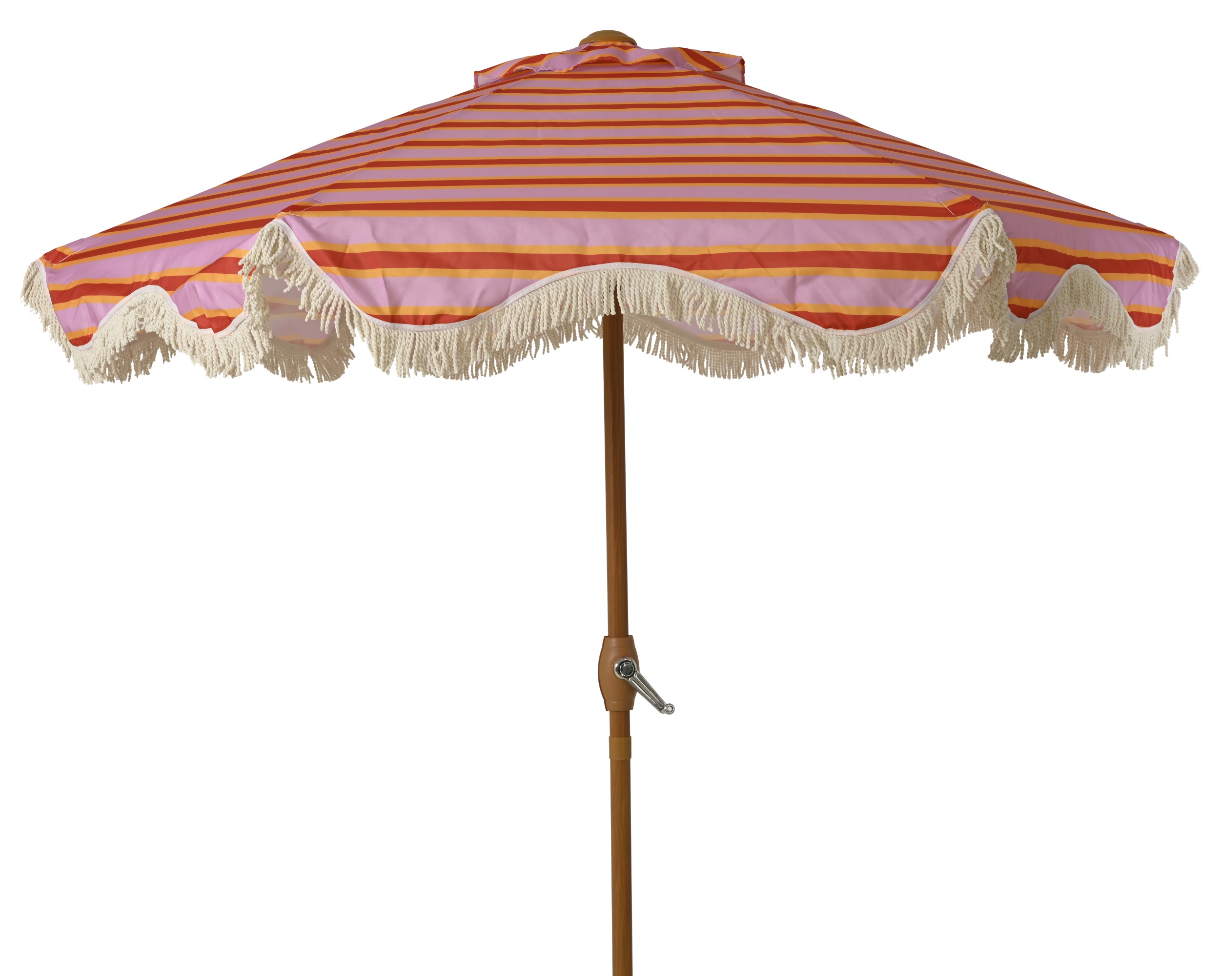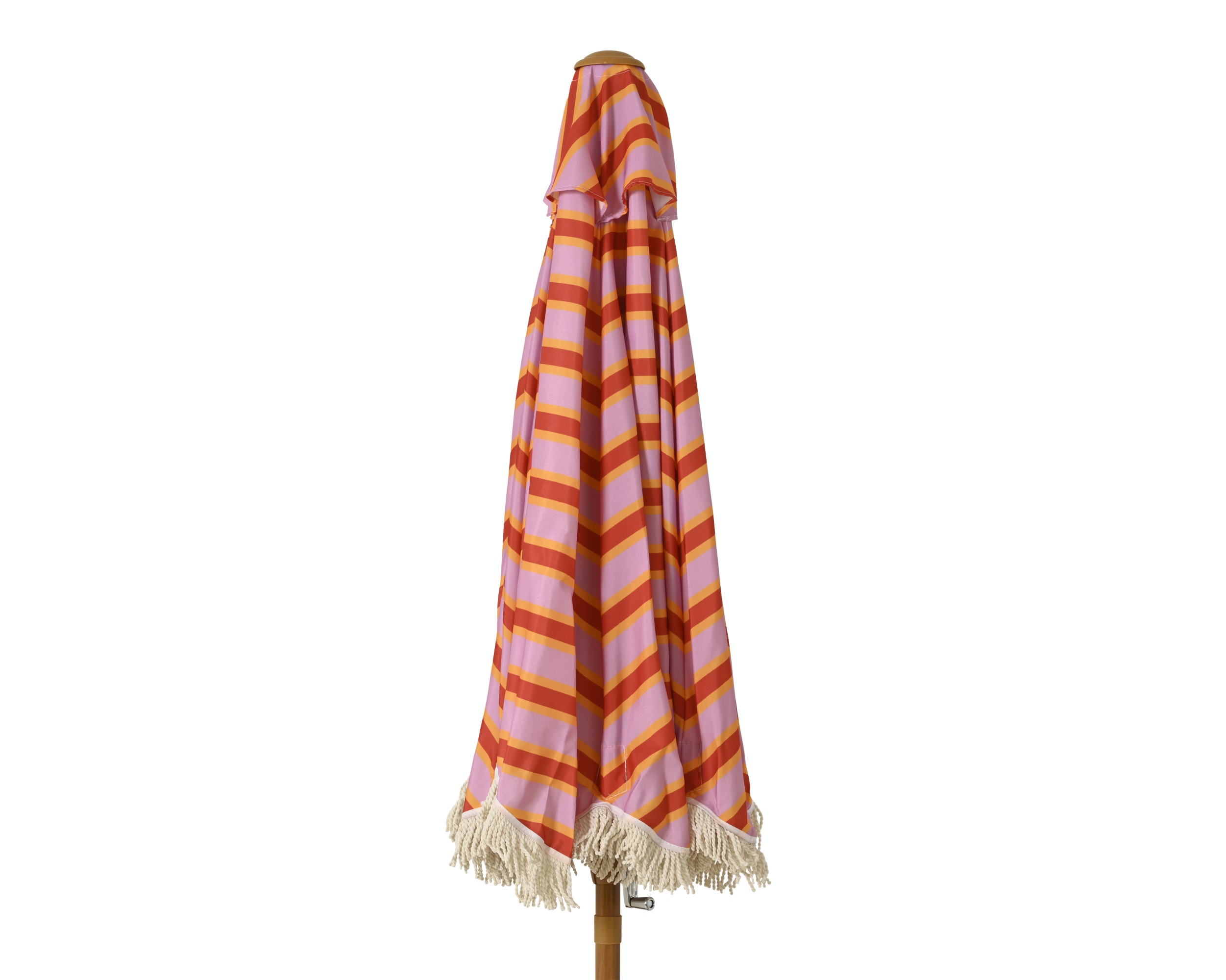 Με διάμετρο 180 εκατοστά και μέγιστο ύψος 210 εκατοστά, δημιουργεί την ιδανική σκίαση για εξωτερικούς χώρους. Το ανθεκτικό ύφασμά της σε πλούσια λιλά απόχρωση με εντυπωσιακές κόκκινες και κίτρινες ρίγες και διακριτικό τελείωμα μακραμέ προσδίδει μια ζεστή, πολύχρωμη νότα στο χώρο.